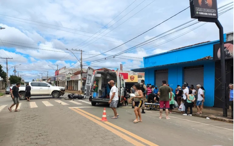 Motorista de caminhonete invade parada obrigatória em Patos de Minas, atinge motocicleta e duas pessoas ficam feridas