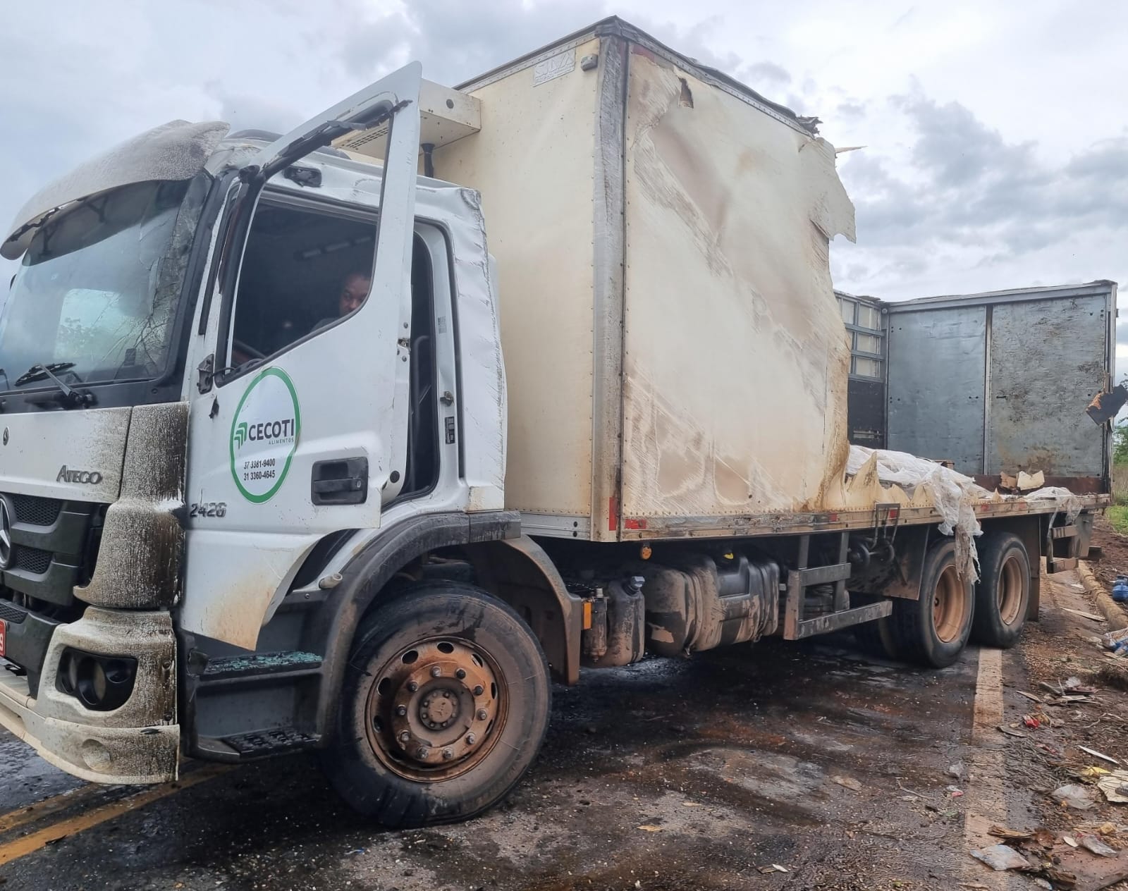 O caminhão sofreu danos na estrutura do baú, mas, após