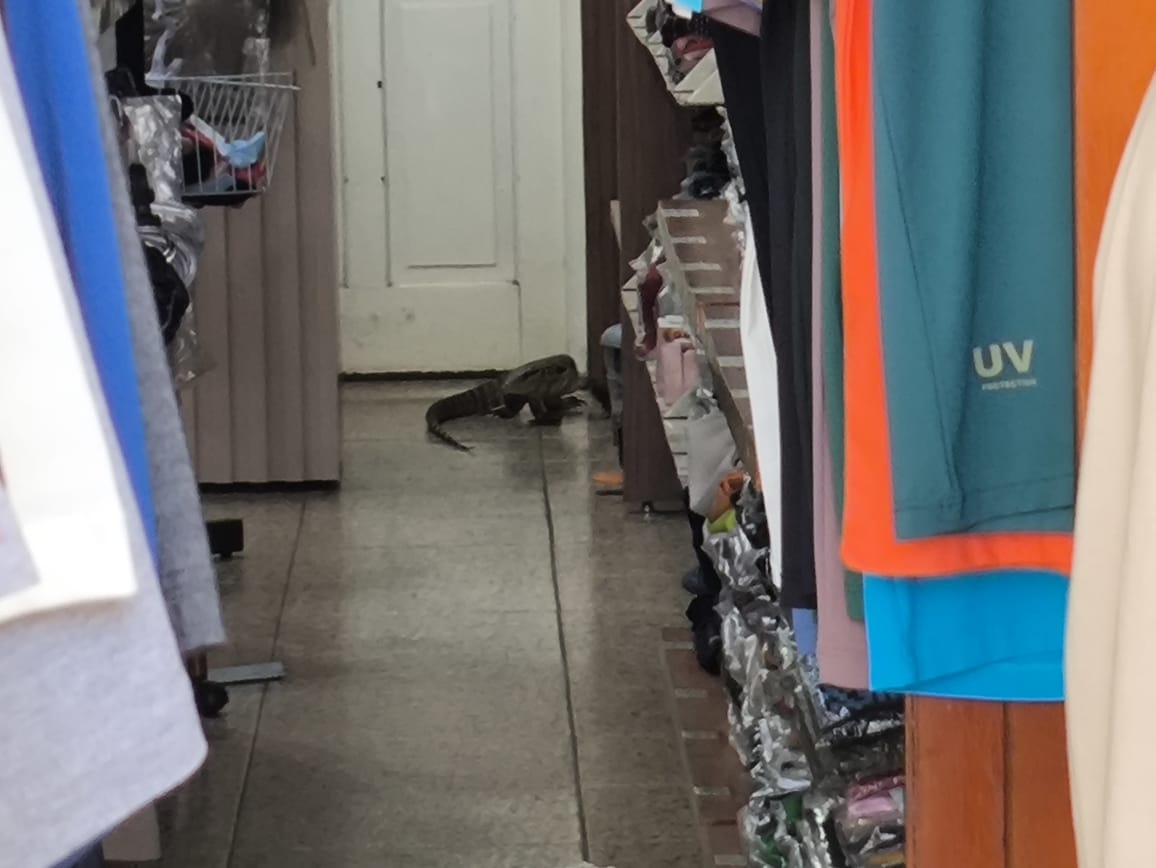 O Teiú saiu de um imóvel e foi direto para dentro do estabelecimento comercial na Rua José de Santana