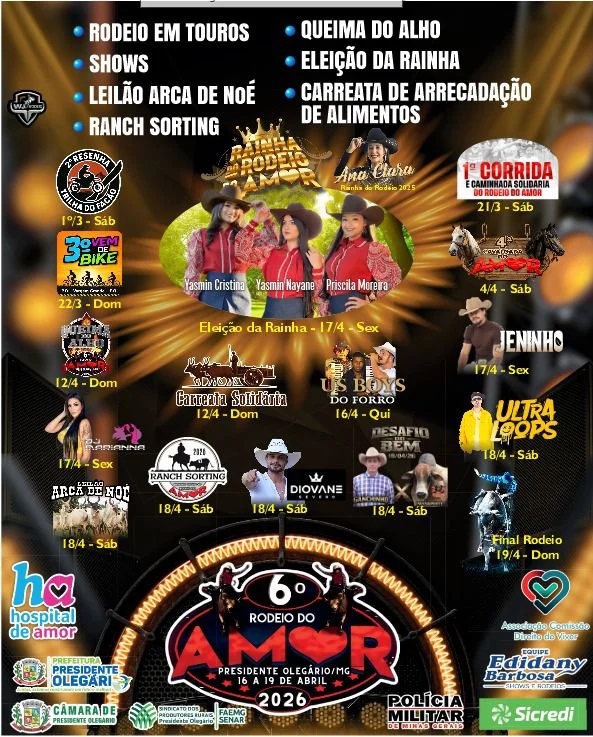A cidade de Presidente Olegário vive dias de muita movimentação com o tradicional Rodeio do Amor 2026, realizado entre os dias 16 e 19 de abril, reunindo cultura, música, esporte e solidariedade.