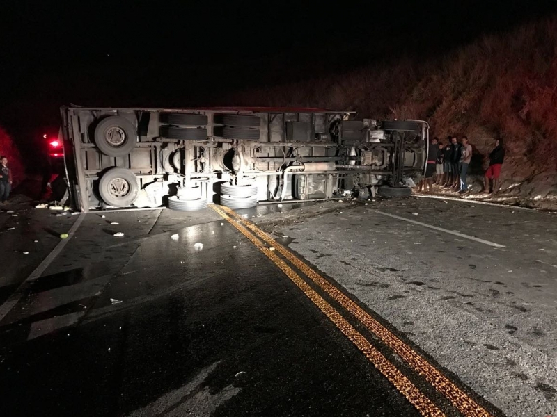 Caminhoneiro fica preso às ferragens após tombar caminhão na Curva da Catiara