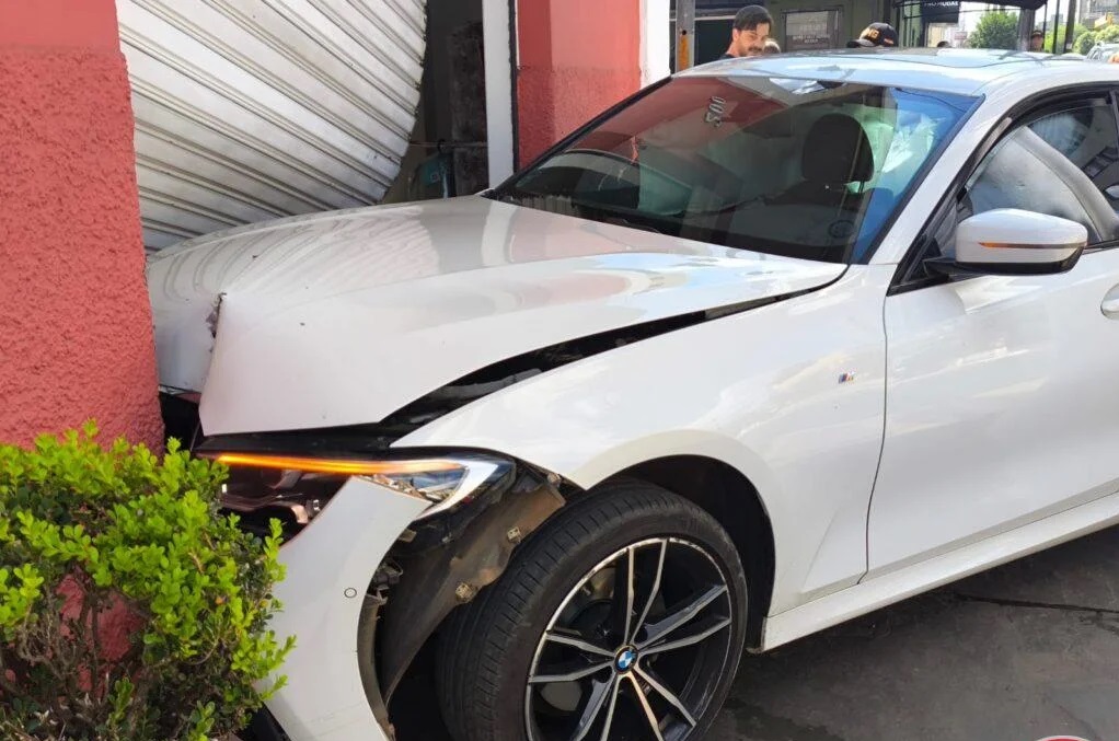 Com o impacto da colisão, o condutor da BMW perdeu o controle da direção, subiu no passeio e acabou atingindo a porta de um estabelecimento comercial. O local sofreu danos consideráveis em sua estrutura.