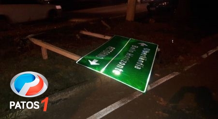 Motorista desvia de cavalete, perde controle e atinge placa de sinalização