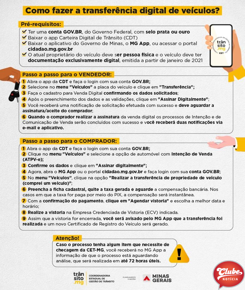 Com a transferência digital, o vendedor formaliza a transação no momento da venda, e as informações são registradas instantaneamente nas bases estaduais. O comprador apenas deverá levar o veículo ao ponto de vistoria para que, após a inspeção, a transferência de propriedade seja finalizada. Todo o processo é monitorado pela Coordenadoria Estadual de Gestão de Trânsito (CET-MG).